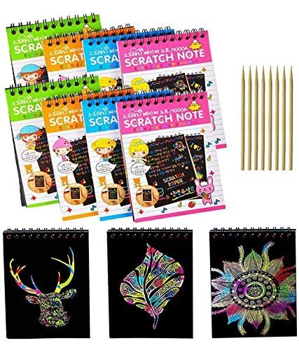 The 12pcs Scratch Book Set is a fun and creative art kit for kids and adults, perfect for drawing, doodling, and designing unique artworks by scratching away the black surface to reveal vibrant rainbow colors underneath.